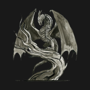 Description: A wyvern resting in its tree. This is a render of a traditional sketch. I started with a rough pencil lineart and went over that with an ink wash of black Indian ink.