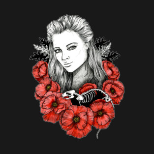 Description: Black and white ink drawing of a girl surrounded by red poppy flowers together with her skeleton rat friend
